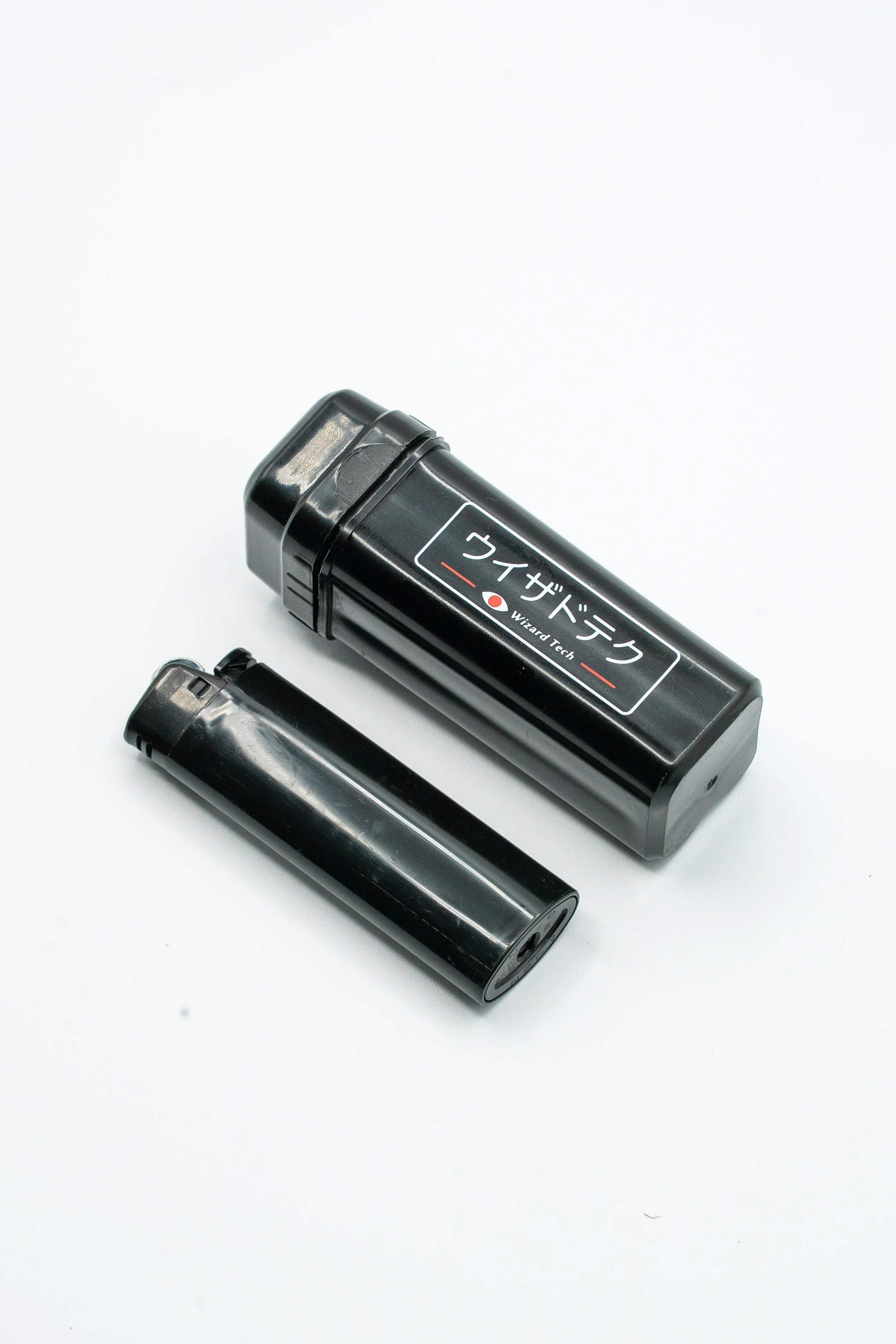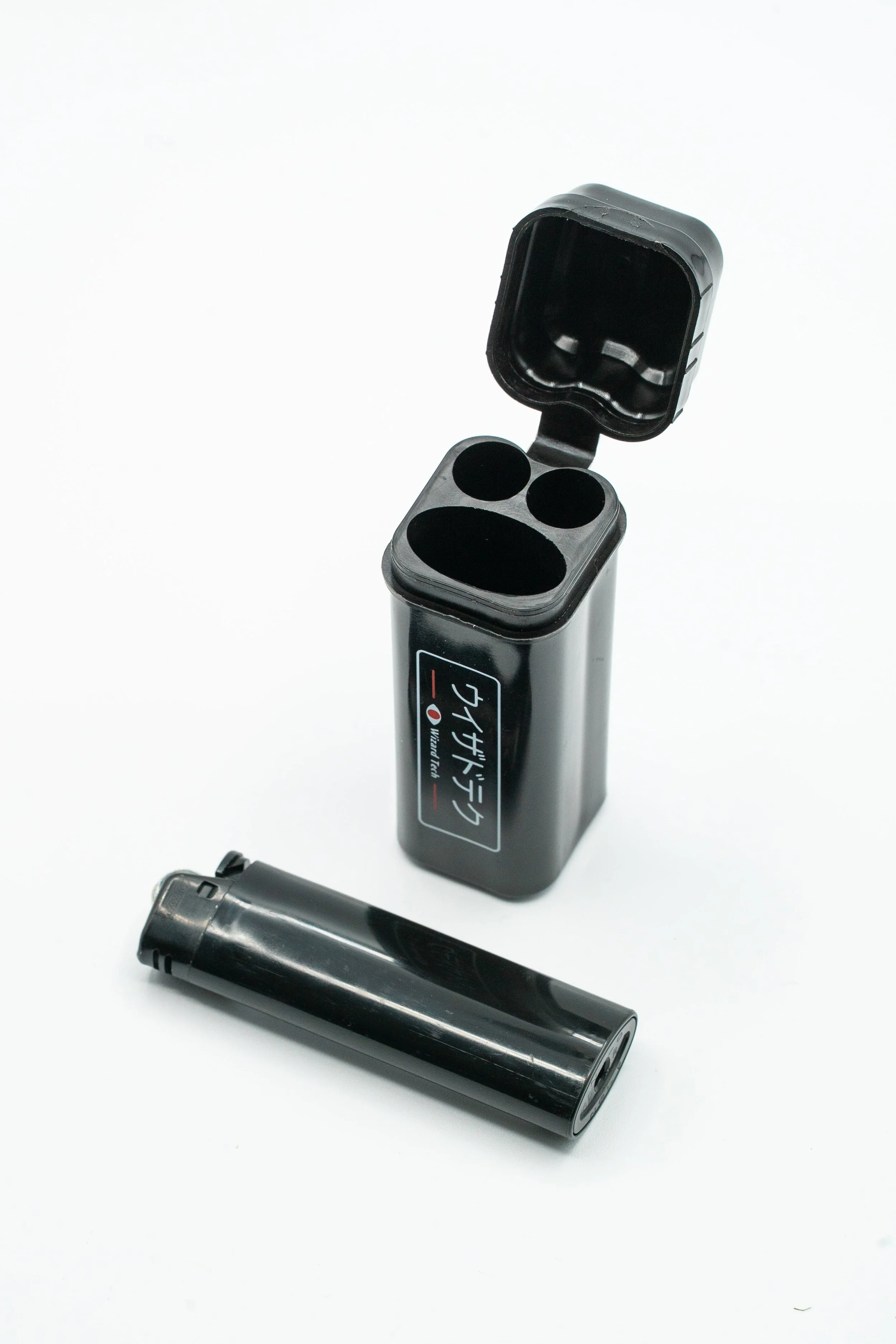 HDPE molded with 3 compartments (1 standard lighter + 2 “cigarette” sized cylinders)